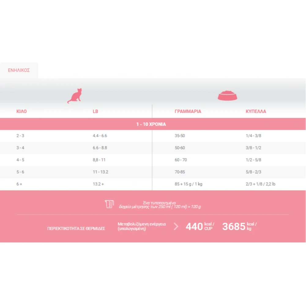 ΑΝΑΛΥΣΗΑκατέργαστες πρωτεΐνες 28% και άνω, ακατέργαστο λίπος 18% και άνω, ακατέργαστες ινώδεις ουσίες έως 3%, υγρασία έως 10%, τέφρα έως 8,5%, ασβέστιο 1,1% και άνω, φώσφορος 0,9% και άνω, μαγνήσιο έως 0,1%, βιταμίνη Α 34.000 IU/kg, βιταμίνη D3 2.000 IU/kg, βιταμίνη Ε 150 IU/kg, ταυρίνη 2.100 mg/kg, μονο-ολιγοσακχαρίτες 1.000 mg/kg, φρουκτο-ολογοσακχαρίτες 500 mg/kg.