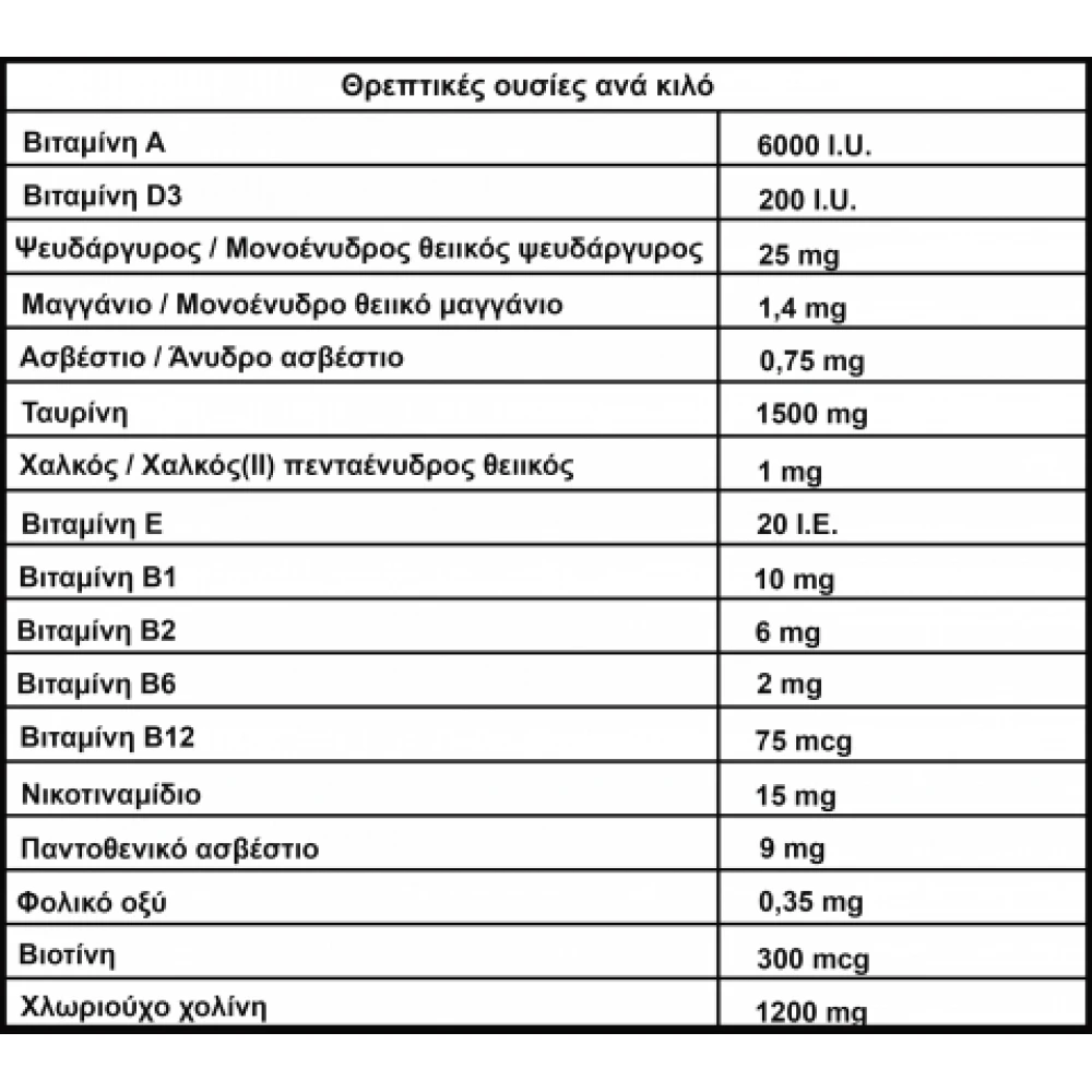 Μεταβολιστέα ενέργεια: 993,5/kcal ανά κιλό (69,55Kcal ανά μερίδα).