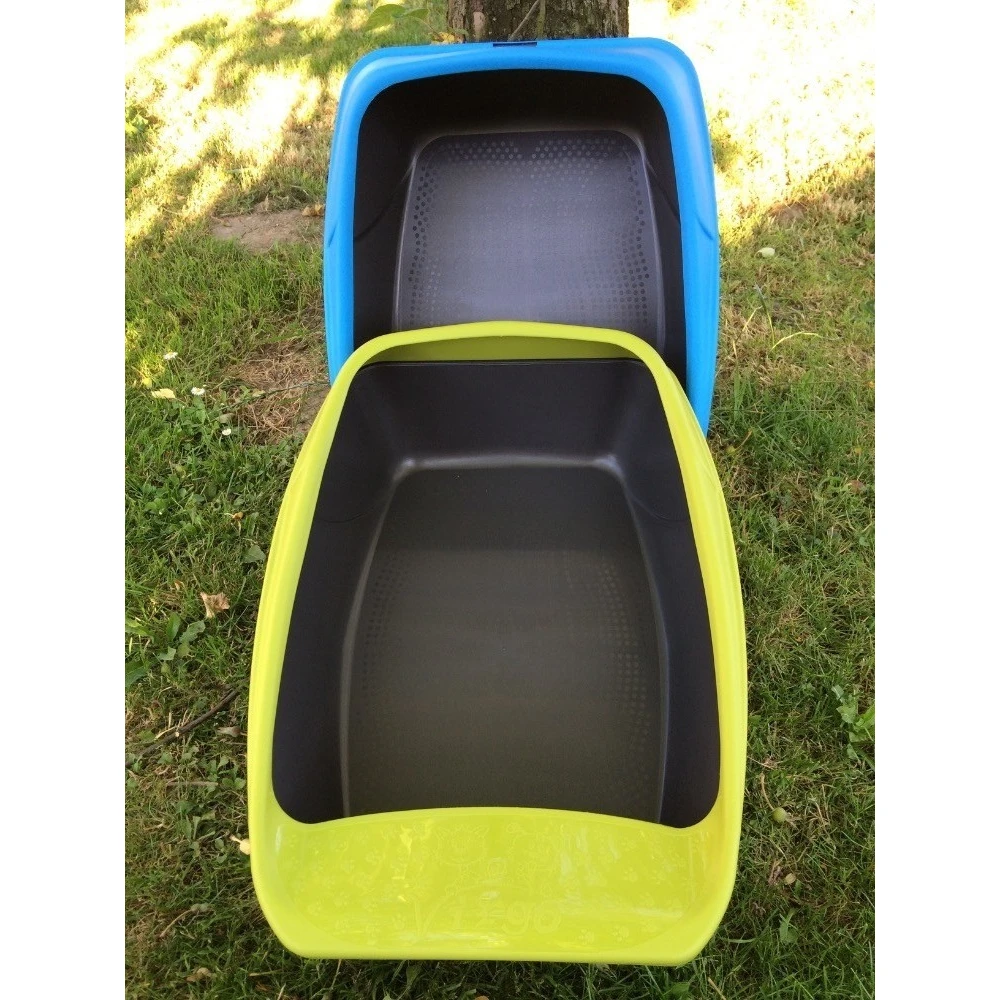 Τουαλέτα γάτας με αφαιρούμενη άκρη. Η τουαλέτα έχει μια ανυψωμένη πλάτη που εμποδίζει την εκτόξευση βρωμιάς όταν οι γάτες σκάβουν για να καλύψουν τα περιττώματά τους.