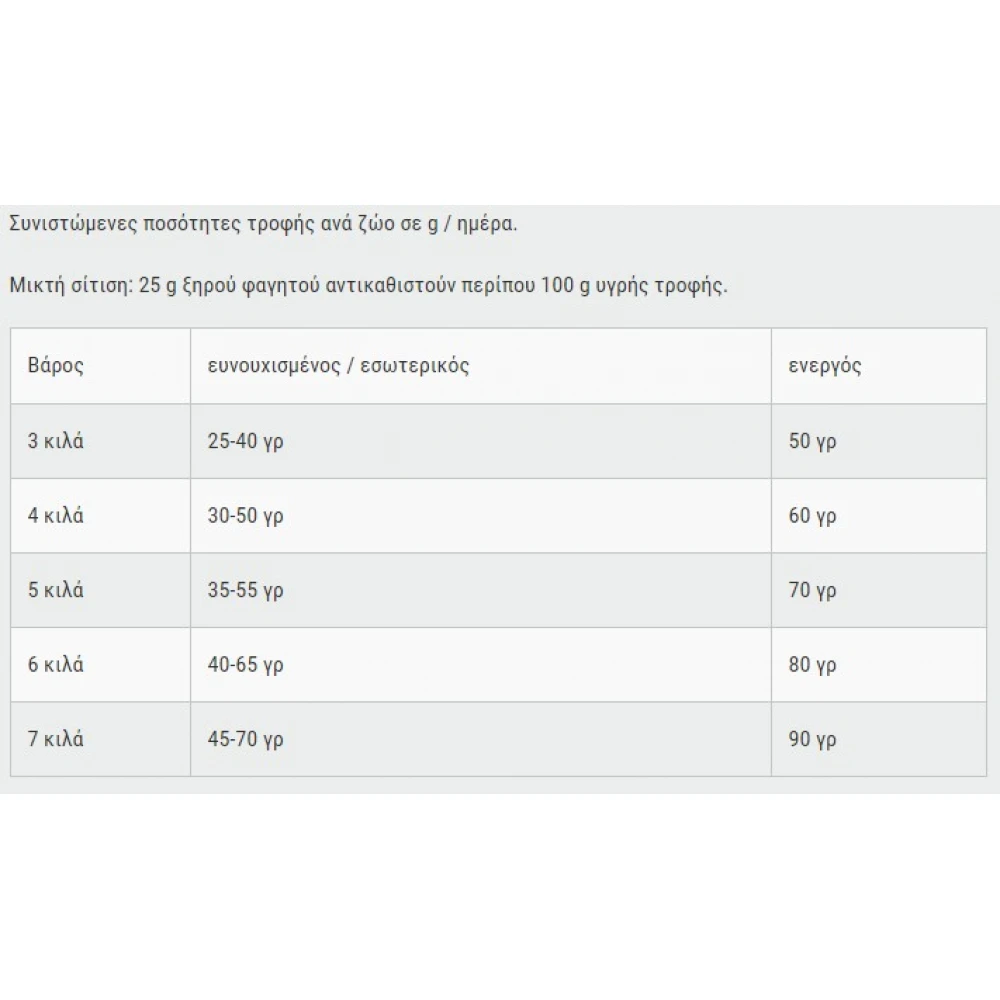 Νωπό κρέας πουλερικών (30%) Πρωτεΐνη πάπιας, αποξηραμένη (18%) Ρύζι; Πρωτεΐνη πουλερικών, χαμηλή τέφρα, αποξηραμένα (10%) Αμυλο πατάτας; Λίπος πουλερικών; Συκώτι πουλερικών, υδρολυμένο; Σίκαλη, βύνη Αυγό, αποξηραμένο; Θαλασσινό γεύμα (2,5%) Θαλάσσιο ζωοπλαγκτόν, έδαφος (κριλ, 2,5%); Μαγιά μπύρας, αποξηραμένη Εξωθητής σπόρων σταφυλιών (1,5%). Σπόροι Chia (1,3%); Γεύμα χαρούπι, αποξηραμένο Guar κόμμι; Χλωριούχο νάτριο; Χλωριούχο κάλιο; Ινουλίνη ραδικιού