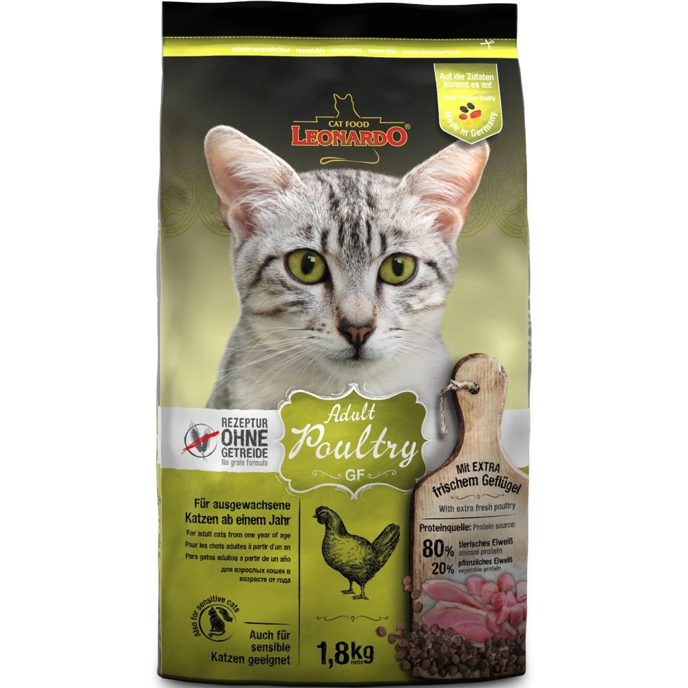 Η συνταγή του LEONARDO Adult Poultry GF δεν περιέχει γλουτένη ή κόκκους. Ο πλούσιος σε θρεπτικά συστατικά αμάραντος αντικαθιστά τον κόκκο σε αυτήν τη σύνθεση. Το LEONARDO Adult Poultry GF είναι η τέλεια λύση, ειδικά για γάτες με δυσανεξία στα τρόφιμα ή γάτες επιρρεπείς σε αλλεργίες .