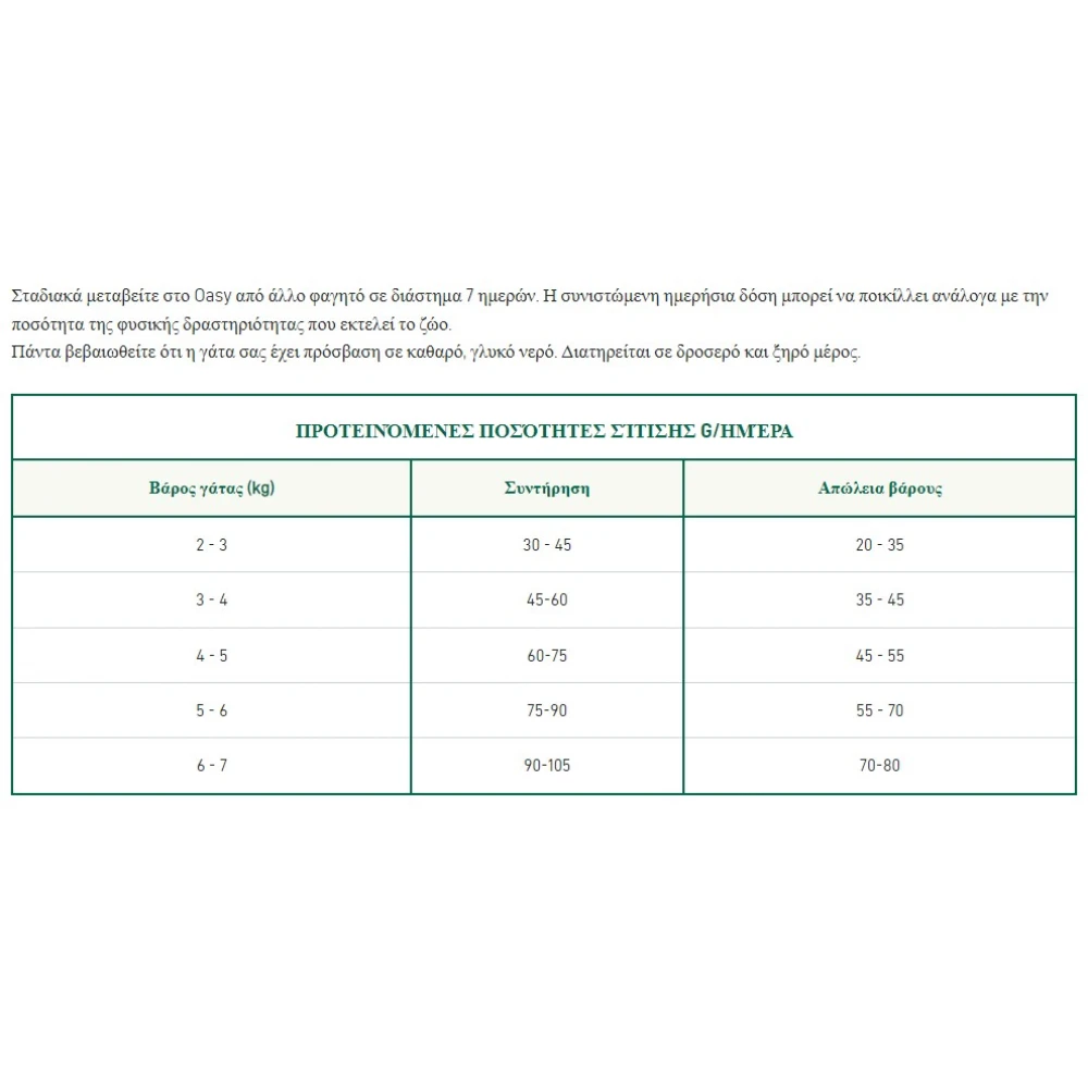 Ελεγχος βάρους: Η χαμηλότερη περιεκτικότητα σε λιπαρά, σε σύγκριση με το Oasy Adult Chicken, προάγει τον έλεγχο του βάρους, συμβάλλοντας στη διατήρηση της βέλτιστης σωματικής κατάστασης των γατών. Η L-καρνιτίνη βελτιστοποιεί τη χρήση των αποθεμάτων λίπους, για ισχυρή και άπαχη μυϊκή μάζα.