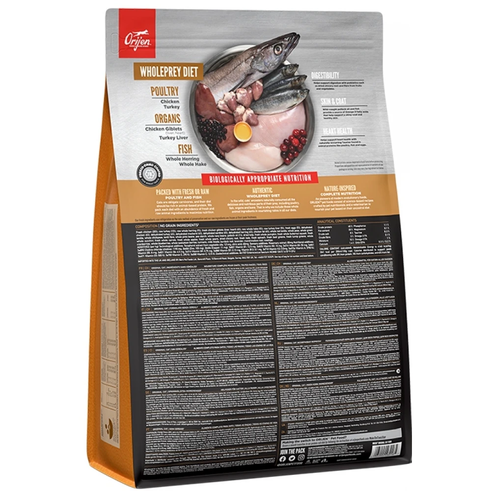Η ORIJEN® Original Cat ετοιμάζεται με φρέσκα ή ωμά και ελευθέρας βοσκής κοτόπουλο και γαλοπούλα, αλλά και ψάρια αλιευμένα στη φύση.