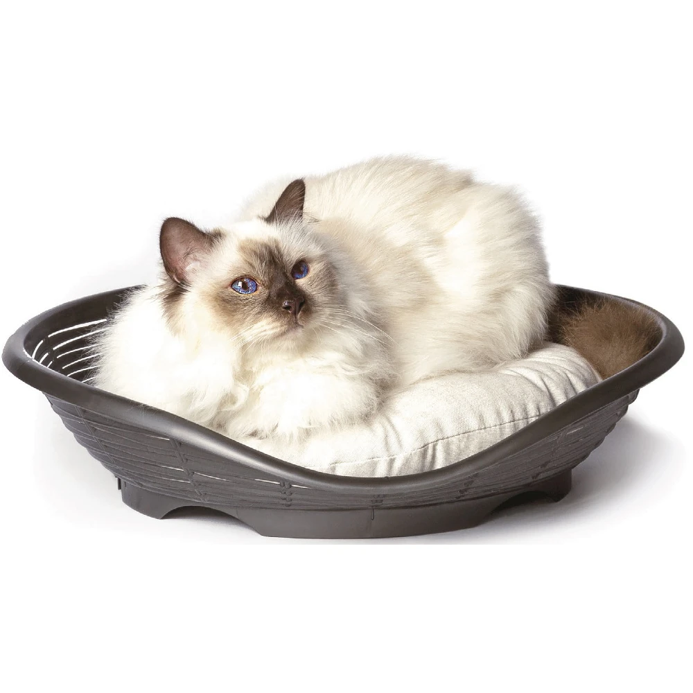 Κομψό πλαστικό κρεβάτι με πλεκτή υφή (rattan) και ένθετο μαξιλάρι, ιδανικό για γάτες και μικρού μεγέθους σκύλους. Ο ειδικός σχεδιασμός του το καθιστά πραγματικό στοιχείο διακόσμησης στο σπίτι. Διαθέτει βάση που ‘αναπνέει’ για καλύτερη και πιο άνετη ανάπαυση.