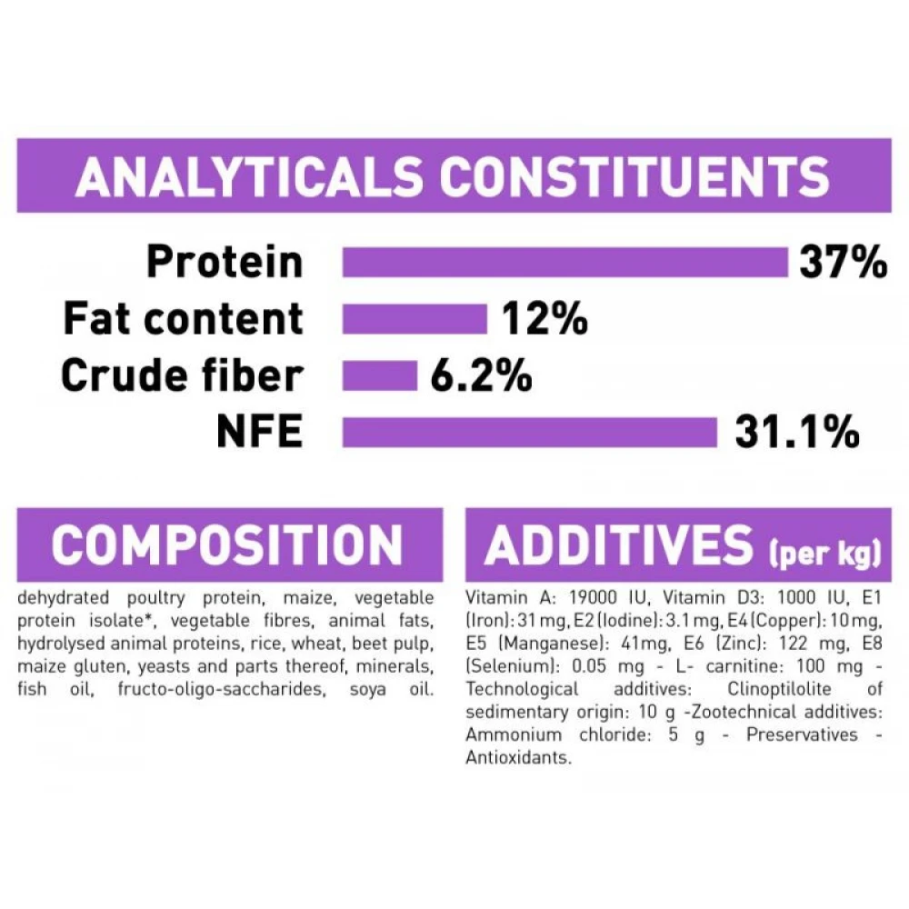 Σύνθεση: πρωτεΐνη πουλερικών (αποξηραμένη), καλαμπόκι, απομονωμένη φυτική πρωτεΐνη*, λιγνοκυτταρίνη, ζωικό λίπος, ζωική πρωτεΐνη (υδρολυμένη), ρύζι, σιτάρι, πολτός τεύτλων, γλουτένη αραβοσίτου, μαγιά και τα μέρη αυτής, μέταλλα, ιχθυέλαιο, φρουκτοολιγοσακχαρίτες, σογιέλαιο.