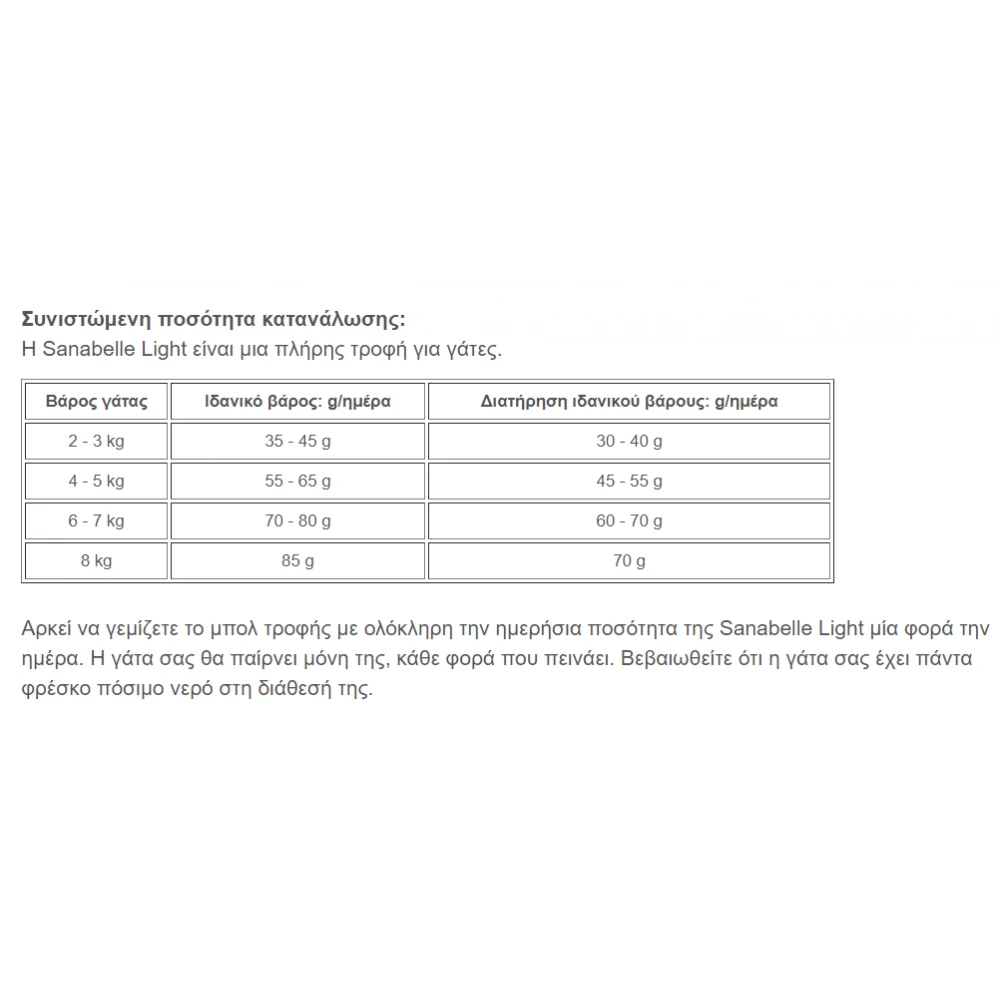 Η Sanabelle Light με πουλερικά είναι μια πλήρης γατοτροφή με μειωμένη ενέργεια (λιπαρά) για γάτες που τείνουν να είναι υπέρβαρες λόγω των χαμηλών επιπέδων δραστηριότητας.